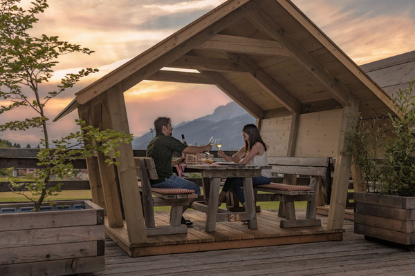 Jetzt NEU ! Reservieren Sie zu ihrem Dinner, einen unserer Logenplätze (überdacht, für bis zu 6 Personen) auf der Sonnenterrasse und genießen Sie den schönen Sonnenuntergang mit Blick Richtung Osttirol.